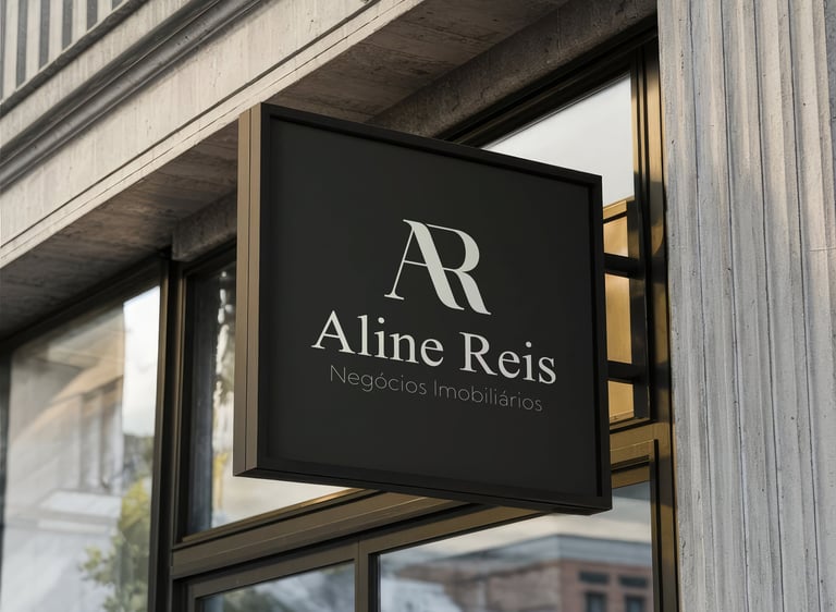 A tipografia clássica do nome, combinada com a fonte mais simples da tagline "Negócios Imobiliários", garante um visual elegante e profissional.